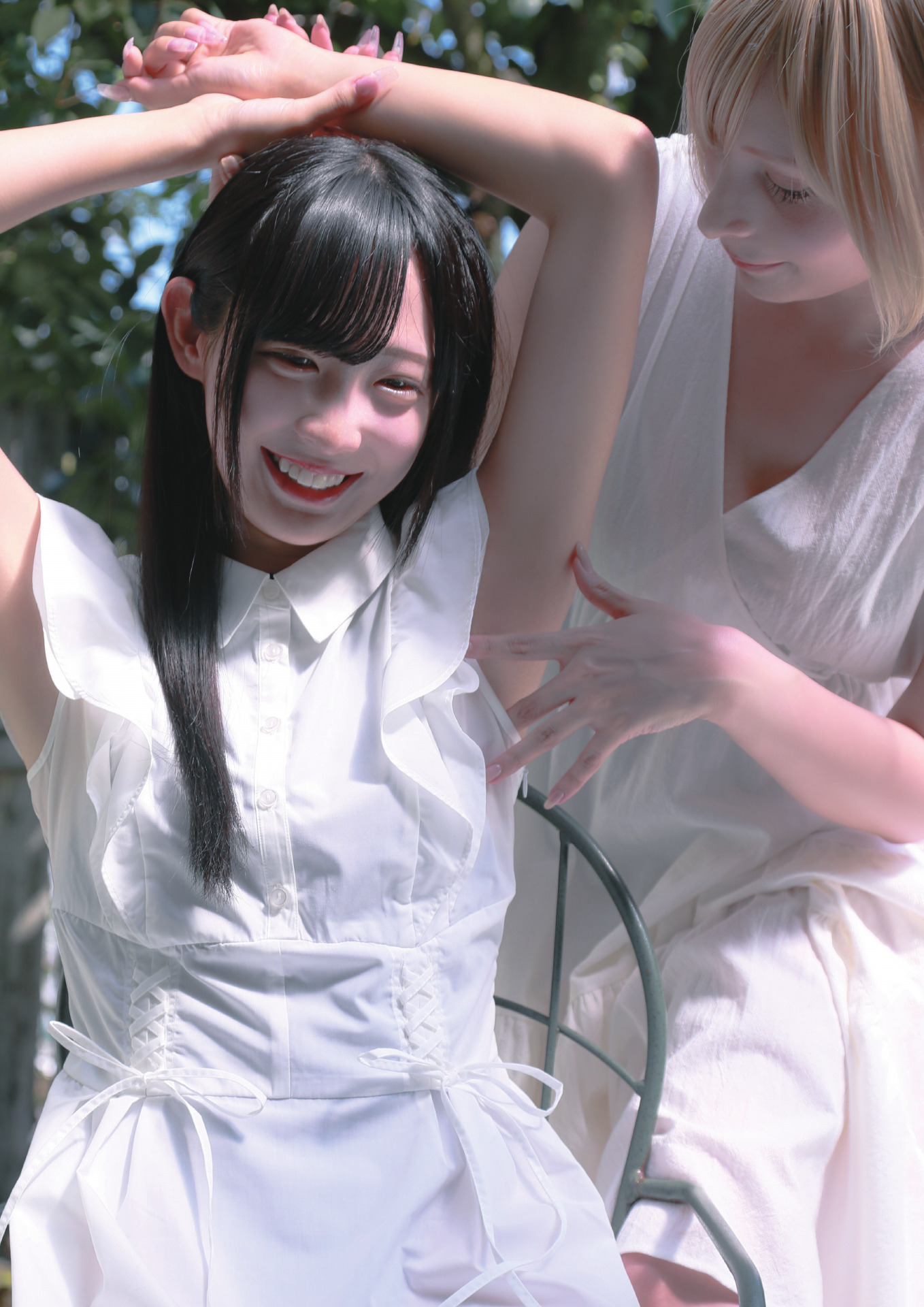 「くすぐり」をテーマに乙女の「秘密」を大胆に曝け出す。真っ白なワンピースに身を包んだふたりの美女は天使か、小悪魔か。わき、足裏といった秘部に密着した完全特化の異色グラビア。ふたりのソロバージョンも発売中!